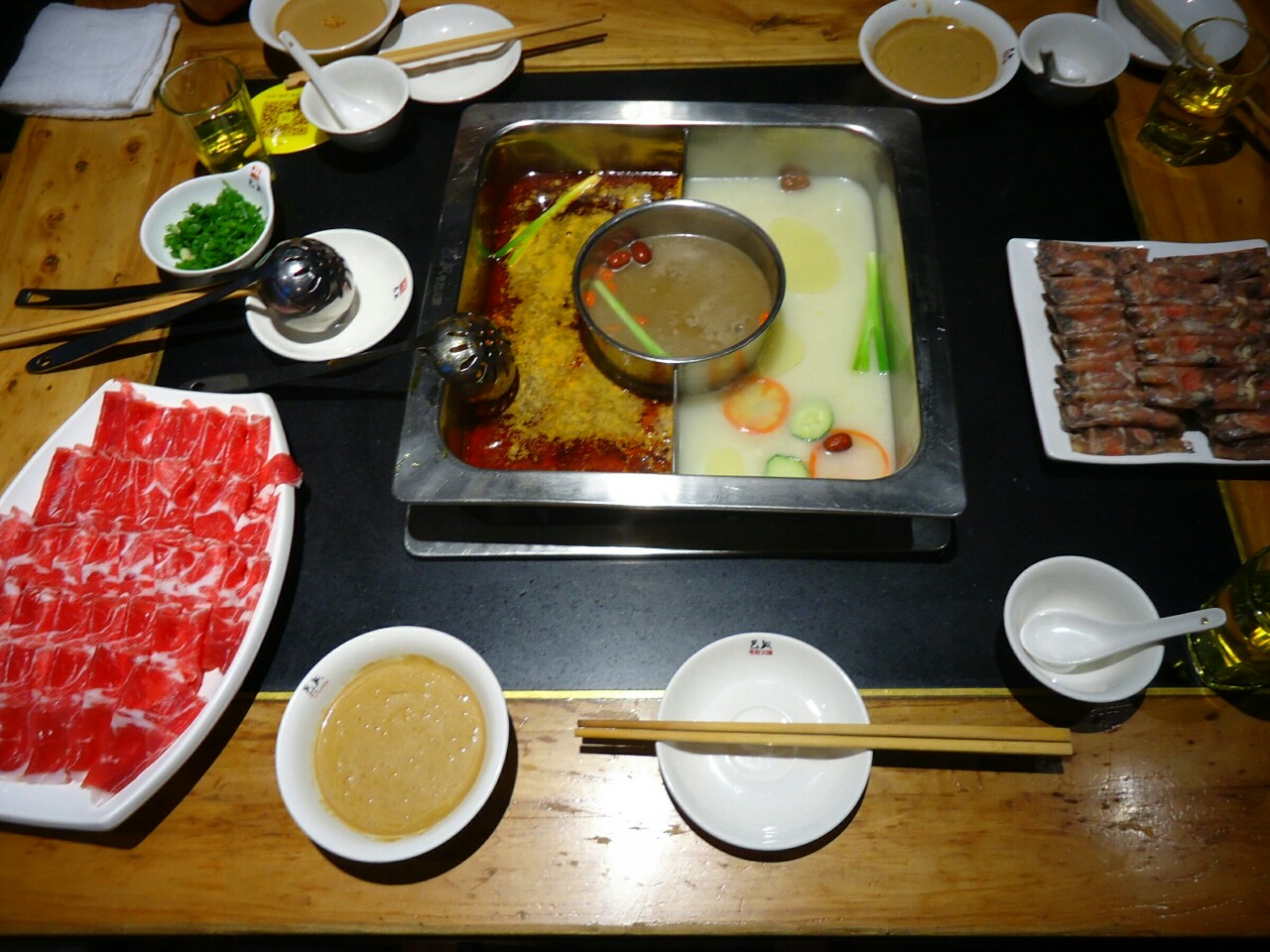 But the best chinese dinner are Hot Pots (photo below left.) You get three hot pots on the table. In the middle one is soup and in the side ones are two boiling sauces where you cook raw food. One sauce is usualy spicy, but normaly you choose sauces and raw food by yourself. On the photo below you can see two types of meet. Left one should be turkey and the right one chicken. Later we got also potatoes, lotuses, spinach, shrimps, rice noodles, one more weird thing from sweet potatoe... A lot of food but after almost two hours of ritual the table was empty. Yes, a meal in China is not just a method to ease the stomach :)