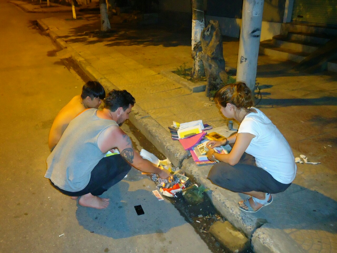 Naslednji postanek je bil, nekoliko nepričakovano, Dong Hoi. Tukaj sva se pobližje spoznala z budističnim obredom darovanja. Najprej se na ulico postavi hrana, bonboni, sadje in nepravi denar. Nekaj hrane in bonbone potem raztresejo po ulici, denar pa zažgejo. Tak denar namenjen darovanju lahko kupite kar na tržnici. Obred izvedejo enkrat na mesec.