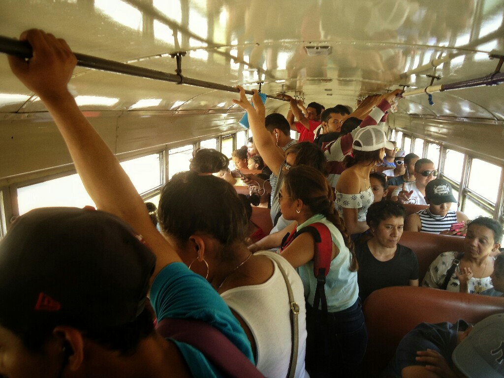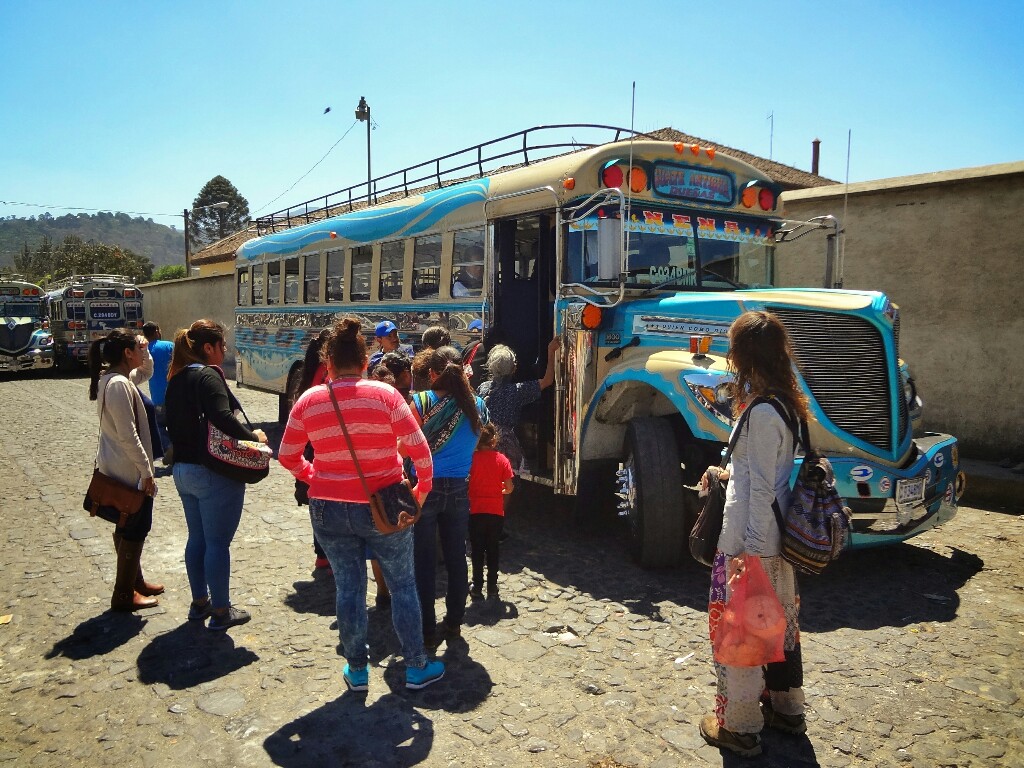 Že nekoliko navličana štopanja, sva se odločila za naslednji najcenejši način prevoza. Tukaj so to lokalni kurji avtobusi (angl. Chicken Bus.)